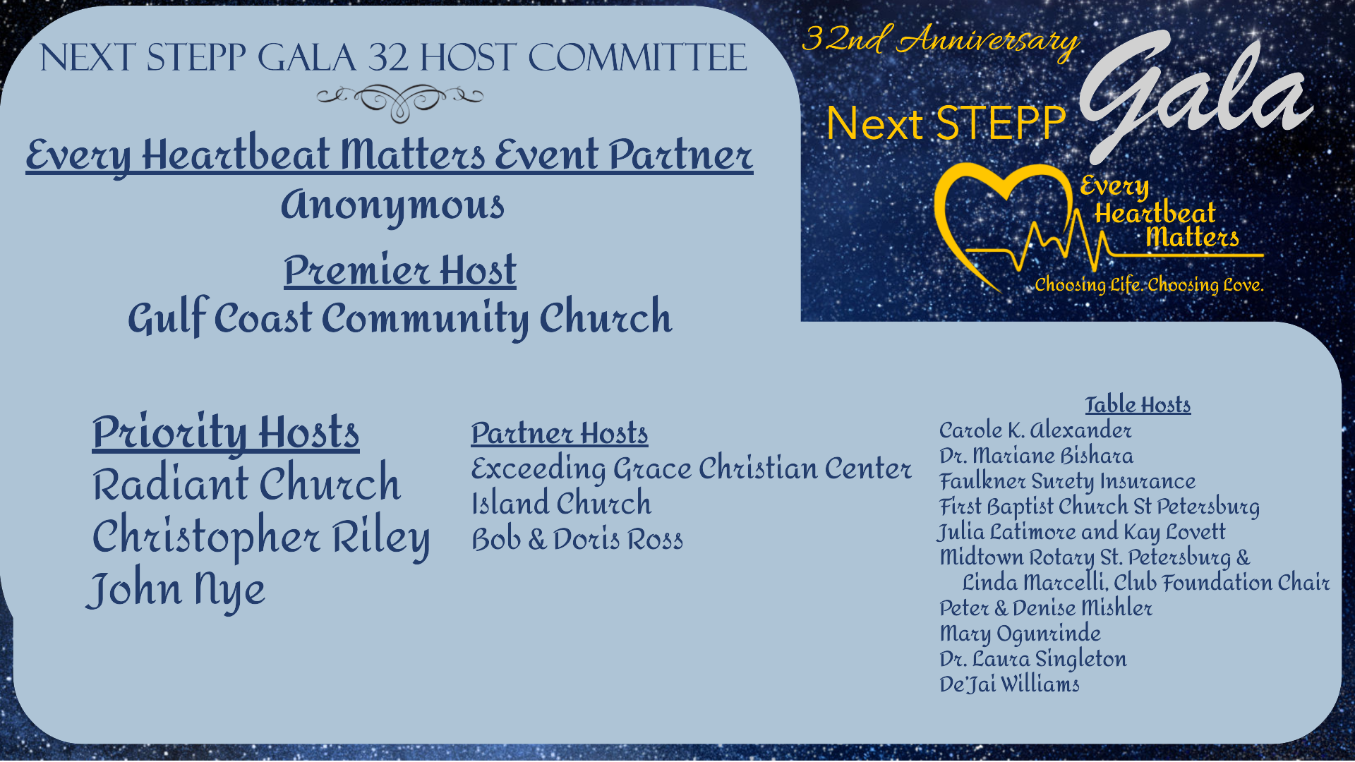 Please help us thank our 2025 Gala 32 Host Committee for their Generous Partnership in Support of Life.